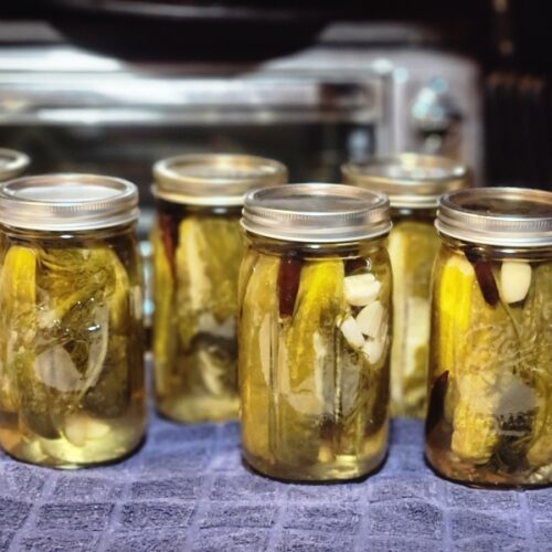 - To each quart, put in 1 red pepper, 1 toe of garlic (or 2, or 3), and some dill