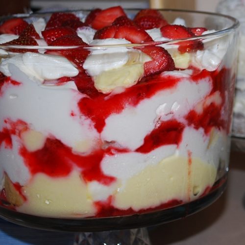• Alternate layers in a glass (trifle) bowl: cake, Jello, pudding, Dream Whip